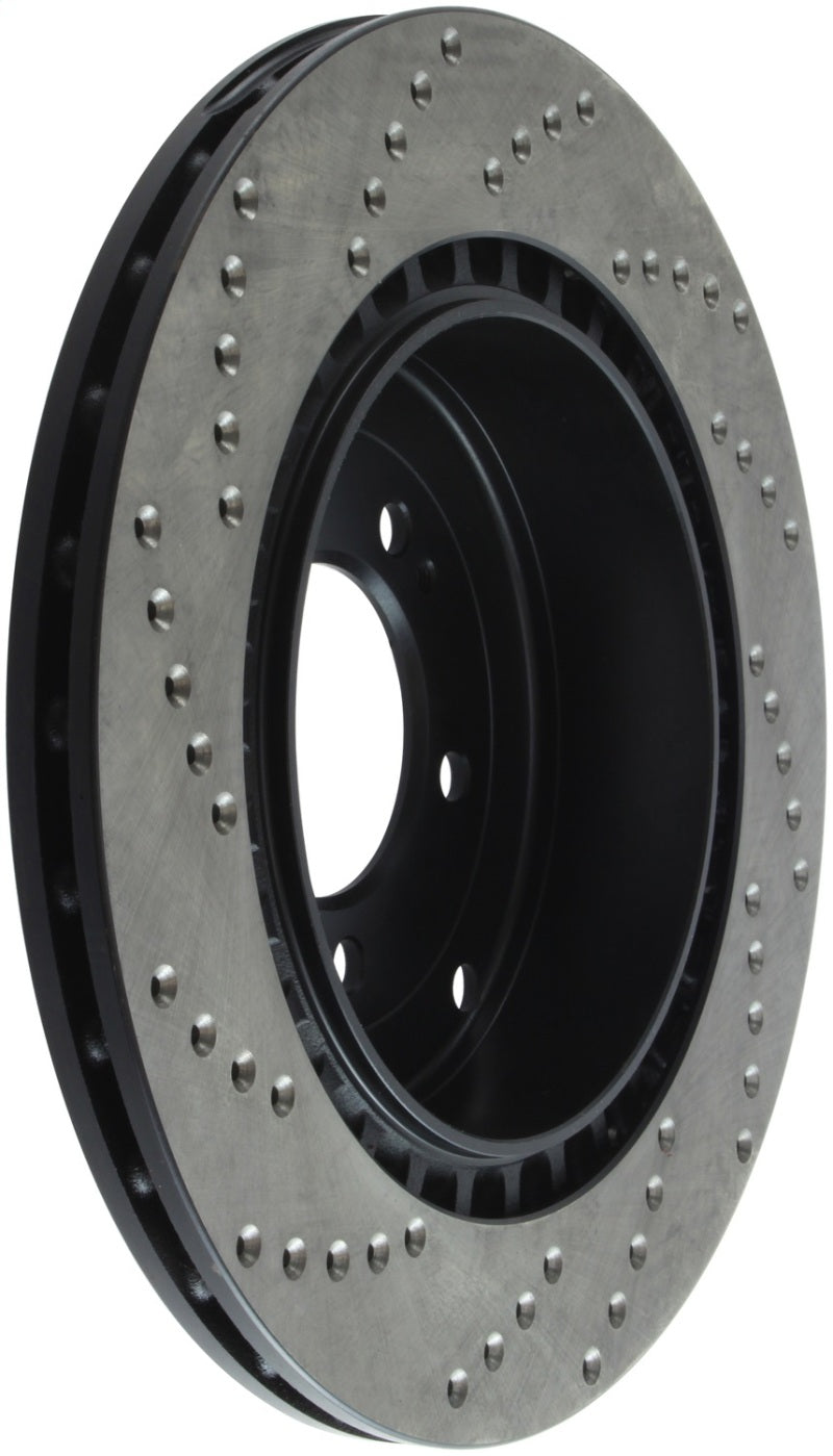 StopTech Drilled Sport Rotors are 1-piece direct replacement brake discs for factory brake systems and stock calipers that look great behind your wheels – and offer significantly improved braking performance. The unique cross-drilling aids with heat and brake dust dispersal; prevents glazing of the pads; adds bite and improves wet and dry braking performance. Built to last; the black e-coating provides protection from corrosion and the high carbon metallurgy (in most applications) offers quieter operation; better crack resistance and increased performance.