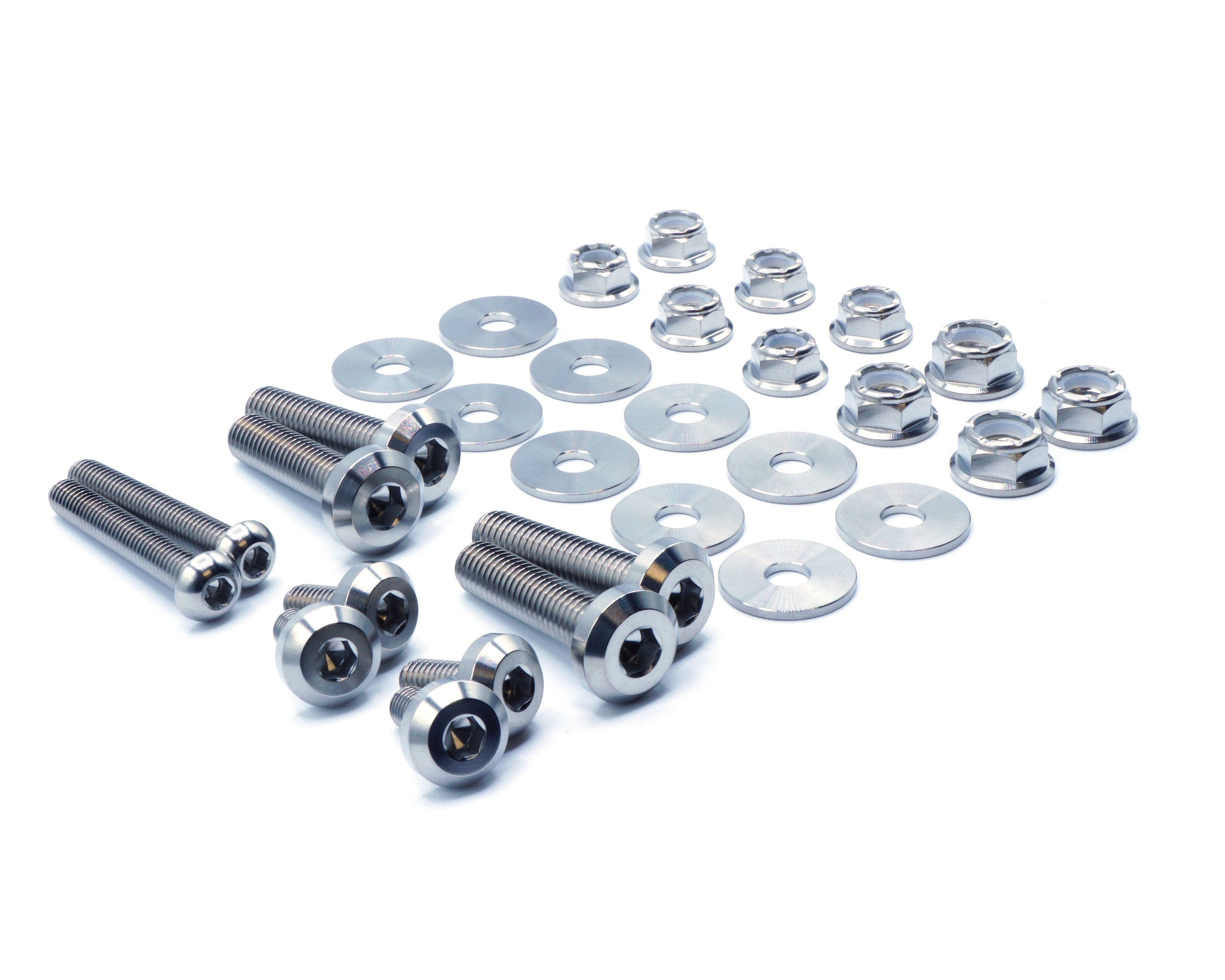 Our 30 piece wing kit includes bolts, nyloc nuts and washers manufactured from extremely durable, anticorrosive, and lightweight GR5 titanium metal. The kit is designed for the Mitsubishi Evo X APR GTC-300 Wing.