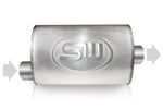 Turbo S-tube muffler, Made from 304 stainless steel for maximum corrosion resistance. This muffler has 2-1/2" ID offset inlet and a 2-1/2" OD center outlet with a 2-1/2" core and shell size 5" x 9" x 14" with an overall length of 18" with a mill finish. Stainless Works is the only manufacturer to make the body, core, and packing out of 304 stainless steel. Exclusive louvered core creates a sweet "Street Rod" deep tone that is very aggressive. These are TIG welded for strength and durability. These kits come with a lifetime warranty and proudly made in the USA.