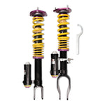 Using the Nordschleife as it's testing grounds and the 7-post rig, KW developed it's V4 Clubsport coilover kit. Wheel loads, vehicle weight and chassis reinforcements (increased body stiffness) can all be taken into consideration with Adjustment -capabilities of the V4 Clubsport. T he KW Clubsport coilovers combine KW's high-end racing technology -with maintenance-free KW OEM quality components. Designed to provide you the ideal product to utilize the full potential of your sports car during autocross, track days, high performance drivers education (HPDE) courses, club racing, and is tested rigorously on race tracks such as the Nurburgring Nordschleife. Race teams rely on KW's racing expertise and experience for their vehicle setup. This same championship winning pedigree is mirrored in the development of each one of the KW Clubsport coilover systems. Similar to the KW Competition suspension used in international motorsports, the KW V4 Clubsport coilover kit allows fine tuning of the compression damping separately in the low-speed and high-speed range. The click adjustments of the TVCLH-A valve technology -ake for easy Adjustment -directly on the reservoir. You can modify the low-speed compression damping with 6 precise clicks with the purple low speed Adjustment -ial and directly beneath it the golden Adjustment -heel provides an additional 14 precise clicks of high speed compression adjustment. In addition, the TVR-A technology -provides 16 clicks to noticeably adjust the rebound damping independently of the compression damping. If you would like to adjust the KW V4 Clubsport coilover kit it can easily be adjusted for more comfort or to an alternative setup for a new race track. The KW V4 Clubsport benefits from the same motorsports technology -hat has proven its endurance with multiple overall wins at the ADAC Zurich 24h Nurburgring race.