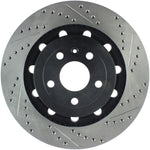 StopTech Drilled and Slotted Sport Rotors are 1-piece direct replacement brake discs for factory brake systems and stock calipers that look great behind your wheels – and offer significantly improved braking performance. The unique cross-drilling and slotting aids with heat and brake dust dispersal; prevents glazing of the pads; adds bite and improves wet and dry braking performance. Built to last; the black e-coating provides protection from corrosion and the high carbon metallurgy (in most applications) offers quieter operation; better crack resistance and increased performance.