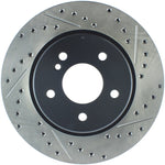 StopTech Drilled and Slotted Sport Rotors are 1-piece direct replacement brake discs for factory brake systems and stock calipers that look great behind your wheels – and offer significantly improved braking performance. The unique cross-drilling and slotting aids with heat and brake dust dispersal; prevents glazing of the pads; adds bite and improves wet and dry braking performance. Built to last; the black e-coating provides protection from corrosion and the high carbon metallurgy (in most applications) offers quieter operation; better crack resistance and increased performance.