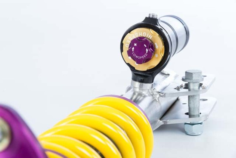 Using the Nordschleife as it's testing grounds and the 7-post rig, KW developed it's V4 Clubsport coilover kit. Wheel loads, vehicle weight and chassis reinforcements (increased body stiffness) can all be taken into consideration with Adjustment -capabilities of the V4 Clubsport. The KW Clubsport coilovers combine KW's high-end racing technology -with maintenance-free KW OEM quality components. Designed to provide you the ideal product to utilize the full potential of your sports car during autocross, track days, high performance drivers education (HPDE) courses, club racing, and is tested rigorously on race tracks such as the Nurburgring Nordschleife. Race teams rely on KW's racing expertise and experience for their vehicle setup. This same championship winning pedigree is mirrored in the development of each one of the KW Clubsport coilover systems. Similar to the KW Competition suspension used in international motorsports, the KW V4 Clubsport coilover kit allows fine tuning of the compression damping separately in the low-speed and high-speed range. The click adjustments of the TV CLH-A valve technology -ake for easy Adjustment -directly on the reservoir. You can modify the low-speed compression damping with 6 precise clicks with the purple low speed Adjustment -ial and directly beneath it the golden Adjustment -heel provides an additional 14 precise clicks of high speed compression adjustment. In addition, the TVR-A technology -provides 16 clicks to noticeably adjust the rebound damping independently of the compression damping. If you would like to adjust the KW V4 Clubsport coilover kit it can easily be adjusted for more comfort or to an alternative setup for a new race track. The KW V4 Clubsport benefits from the same motorsports technology -hat has proven its endurance with multiple overall wins at the ADAC Zurich 24h Nurburgring race.