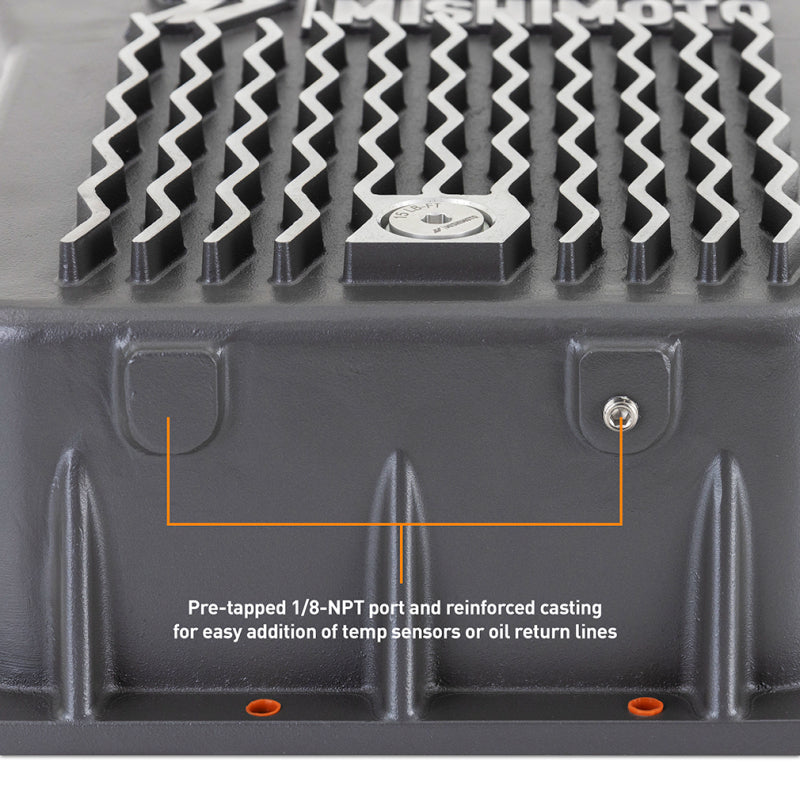 This Mishimoto Aluminum Transmission Pan is a direct-fit, high-performance upgrade for your 2001-2019 Chevy/GMC 6.6L Duramax. Cast from high-quality aluminum and powder coated Gunmetal Gray, our transmission pan is a robust and long-lasting upgrade for your vehicle's transmission. With a sleek design and bottom ribs, this pan not only adds to the overall aesthetic of your truck but also provides improved cooling performance.----This transmission pan features internal baffles that reduce sloshing and enhance heat dissipation, resulting in smoother transmission performance. All the headaches that come with a flat gasket and messy sealants are eliminated with our precision-machined dovetail-style groove and O-ring seal. This groove positively retains the O-ring, so you never have to worry about it falling out of place during installation. Additionally, the Mishimoto 2001-2019 Chevy/GMC 6.6L Duramax Aluminum Transmission Pan adds an extra 6.1 quarts of ATF to help maintain optimal transmission operation.----Fed up with the frustration of trying to hold up a transmission pan with one hand while threading the fasteners in with the other? Mishimoto has you covered with pre-installed bolt retainers that hold the fasteners in the pan, allowing you to easily thread the bolts without dropping them on the ground, your head, or worse, that pan of nasty transmission fluid you just drained. Additionally, our pan comes equipped with a magnetic drain plug for easy draining and a 1/8-inch NPT port and plug for temperature sensors to make servicing your transmission and monitoring temperatures a breeze.----This direct-fit upgrade offers affordable durability and helps maintain smooth transmission operation, ensuring a long life for your transmission. Like all Mishimoto products, this transmission pan is backed by the Mishimoto Lifetime Warranty.