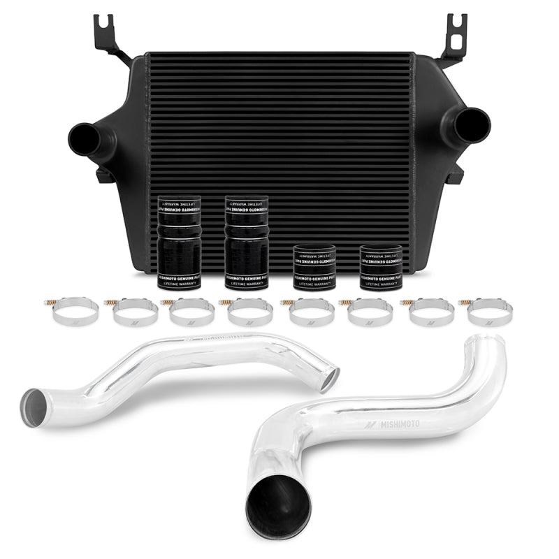Upgrade your 1999-2003 Ford F-Series 7.3L Powerstroke with the Mishimoto Performance Intercooler Kit, a complete stock replacement solution that delivers superior cooling and improved efficiency. At the heart of this kit is our proven bar-and-plate intercooler, originally developed for the 6.0L Powerstroke and now expertly repurposed for 7.3L applications. We've paired this intercooler with custom-designed Mishimoto silicone boots featuring DuraCore technology to ensure a perfect fit on your 7.3L. The result is a comprehensive package that lowers air charge temperatures, reduces EGTs, and supports reliable performance at any power level.--The intercooler itself features a significant increase in core volume over stock, durable cast aluminum end tanks, and an efficient bar-and-plate core design that reduces pressure drop while delivering cooler, denser air to your engine. The kit includes mandrel-bent aluminum piping available in polished or wrinkle-black powder-coated finishes, along with Mishimoto DuraCore silicone boots and constant-tension T-bolt clamps for secure, consistent holding power. DuraCore technology provides superior resistance to heat, pressure, fuel, and oil compared to standard silicone, effectively preventing leaks and blowouts while extending service life.--Installation is straightforward with everything included: custom mounting spacers to properly secure the intercooler, additional hardware for a complete installation, and all necessary components for the conversion. Every part is engineered to last as long as your truck. Available with your choice of black or silver core, the Mishimoto 7.3L Powerstroke Intercooler Kit is backed by our signature lifetime warranty.