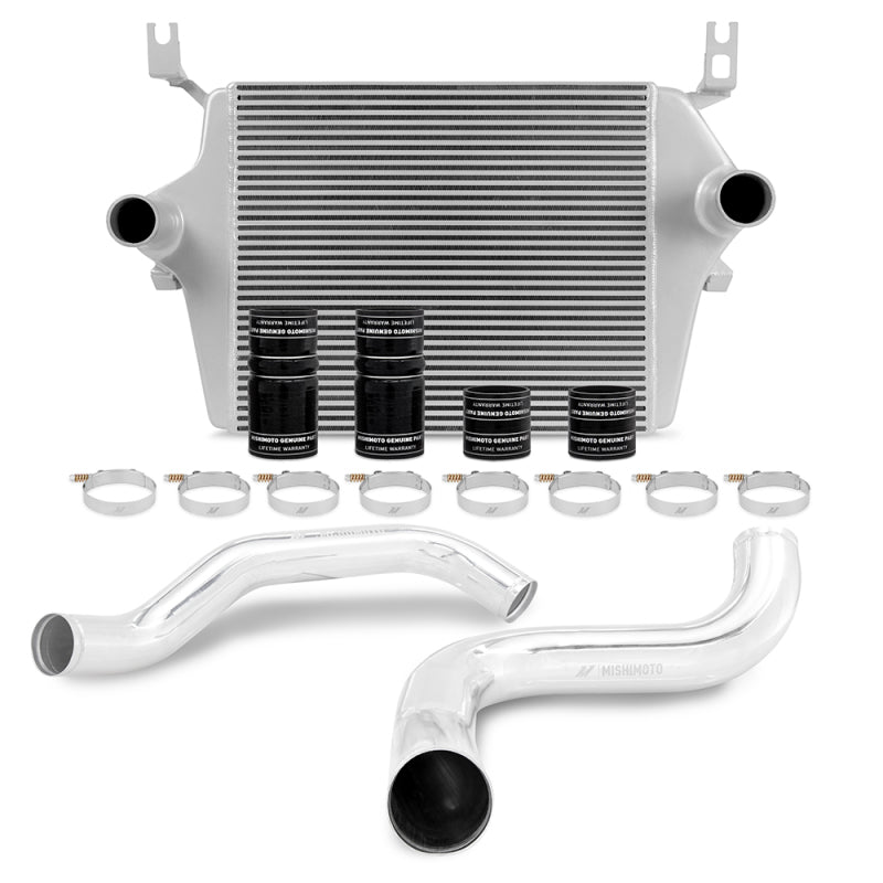 Upgrade your 1999-2003 Ford F-Series 7.3L Powerstroke with the Mishimoto Performance Intercooler Kit, a complete stock replacement solution that delivers superior cooling and improved efficiency. At the heart of this kit is our proven bar-and-plate intercooler, originally developed for the 6.0L Powerstroke and now expertly repurposed for 7.3L applications. We've paired this intercooler with custom-designed Mishimoto silicone boots featuring DuraCore technology to ensure a perfect fit on your 7.3L. The result is a comprehensive package that lowers air charge temperatures, reduces EGTs, and supports reliable performance at any power level.--The intercooler itself features a significant increase in core volume over stock, durable cast aluminum end tanks, and an efficient bar-and-plate core design that reduces pressure drop while delivering cooler, denser air to your engine. The kit includes mandrel-bent aluminum piping available in polished or wrinkle-black powder-coated finishes, along with Mishimoto DuraCore silicone boots and constant-tension T-bolt clamps for secure, consistent holding power. DuraCore technology provides superior resistance to heat, pressure, fuel, and oil compared to standard silicone, effectively preventing leaks and blowouts while extending service life.--Installation is straightforward with everything included: custom mounting spacers to properly secure the intercooler, additional hardware for a complete installation, and all necessary components for the conversion. Every part is engineered to last as long as your truck. Available with your choice of black or silver core, the Mishimoto 7.3L Powerstroke Intercooler Kit is backed by our signature lifetime warranty.