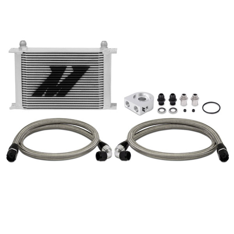 Proper oil temperature regulation is key to extending and preserving the life of your stock or high performance engine.Keep your temperatures in check with the 25-Row Mishimoto Universal Oil Cooler Kit.This kit is applicable for most vehicles and includes all key components for reducing oil temperatures and providing your engine with extra protection against oil degradation.This kit includes a billet anodized aluminum sandwich plate in either standard or thermostatic form.The optional Mishimoto Thermostatic Sandwich Plate provides additional temperature control and will limit oil flow to the cooler until optimal temperatures are reached, making it ideal for those in cooler climates.The included core is our proven Mishimoto 25-row stacked-plate cooler which can withstand high fluid pressures and significantly reduce oil temperatures while exhibiting minimal pressure loss.This kit includes both a 3/4-16 and M20-1.5 sandwich plate adapter which supports fitment for most makes and models.This kit also includes pre-assembled stainless steel braided oil lines with -10AN fittings and dowty seals for durable, leak free connections.Whether you are piloting a boosted rotary or a blown small block, the Mishimoto Universal Oil Cooler Kit will provide the efficiency you need to stay on the track and out of the shop.As with all our products this kit includes the Mishimoto Limited Lifetime Warranty.