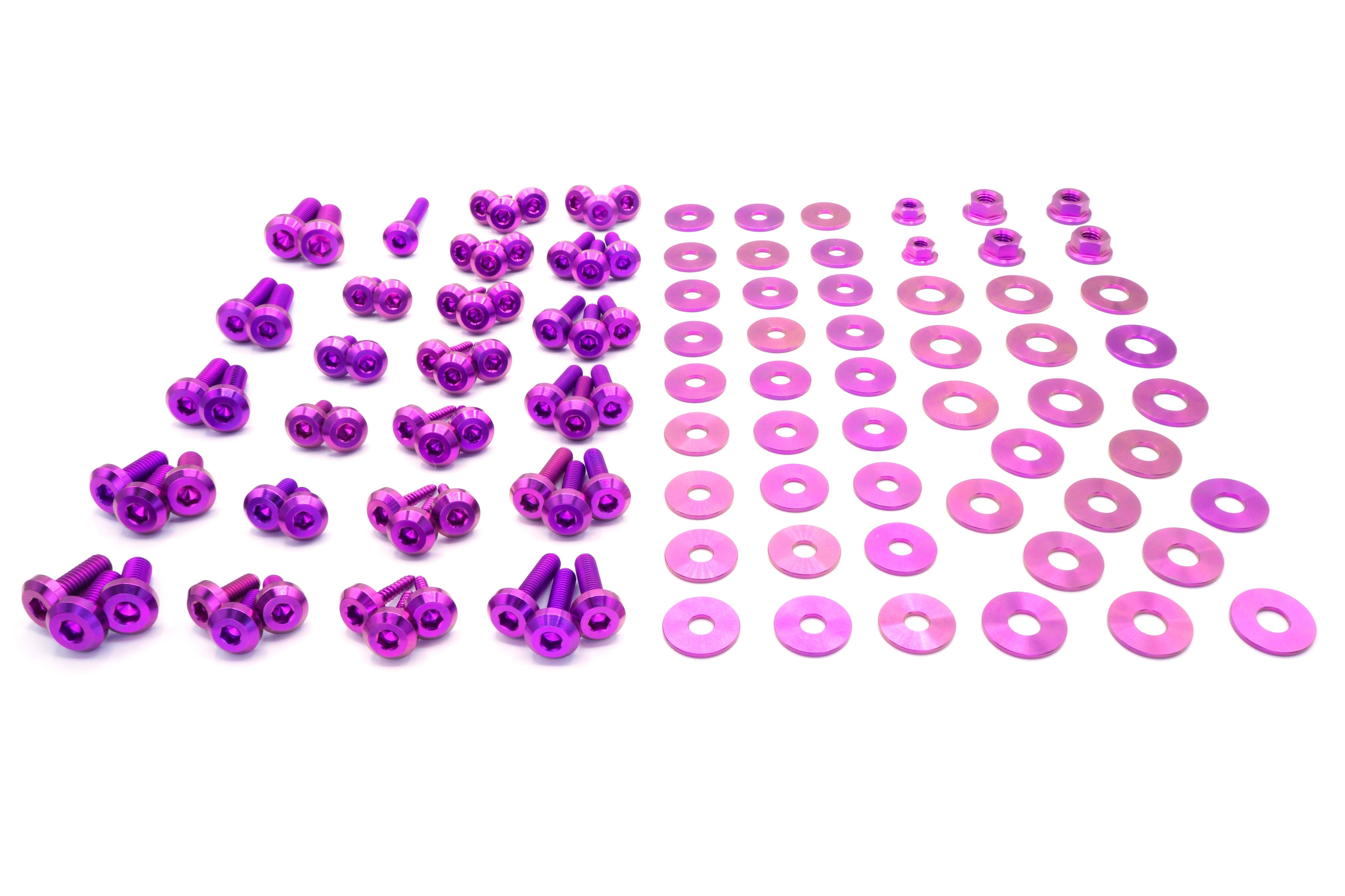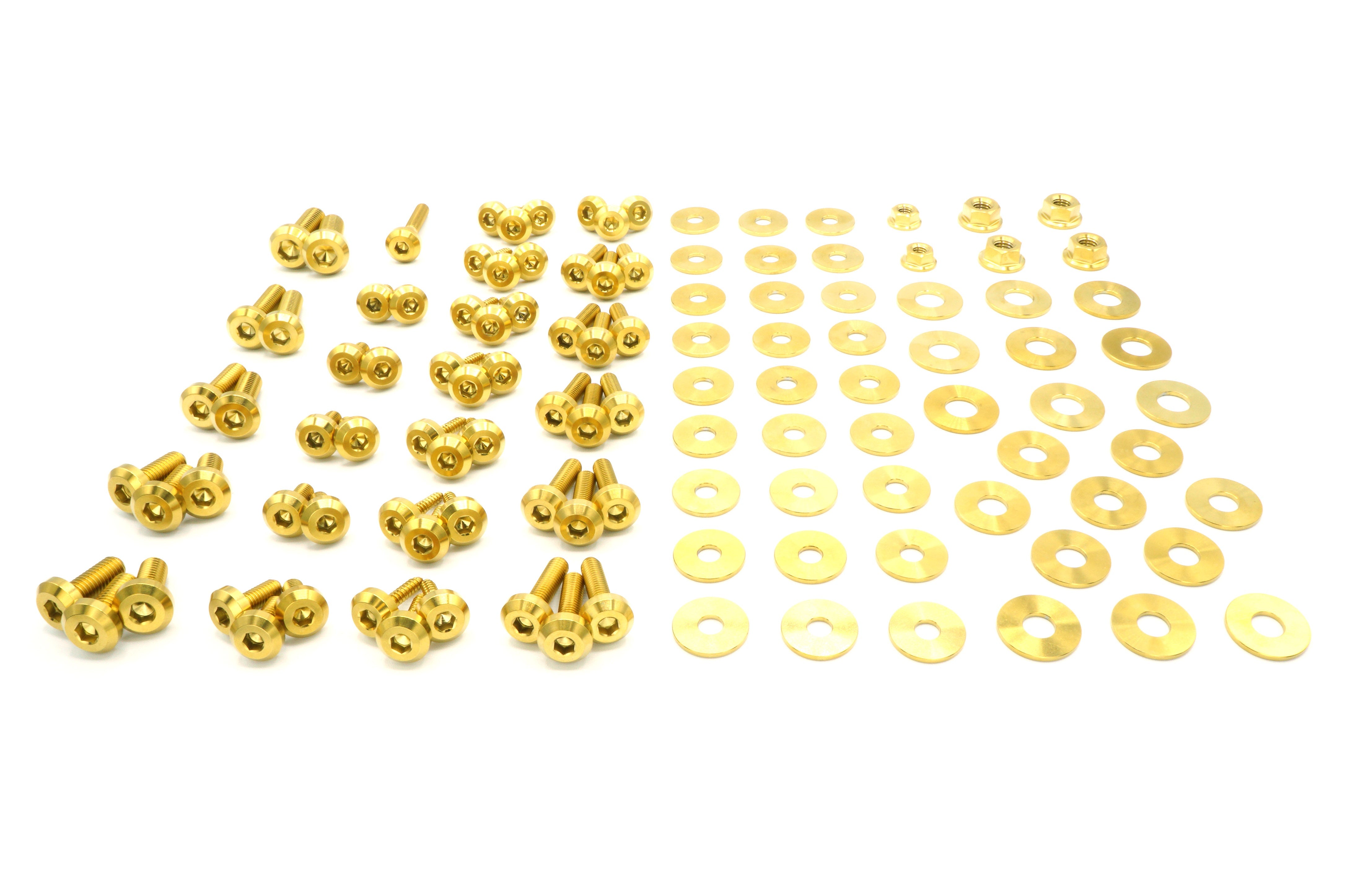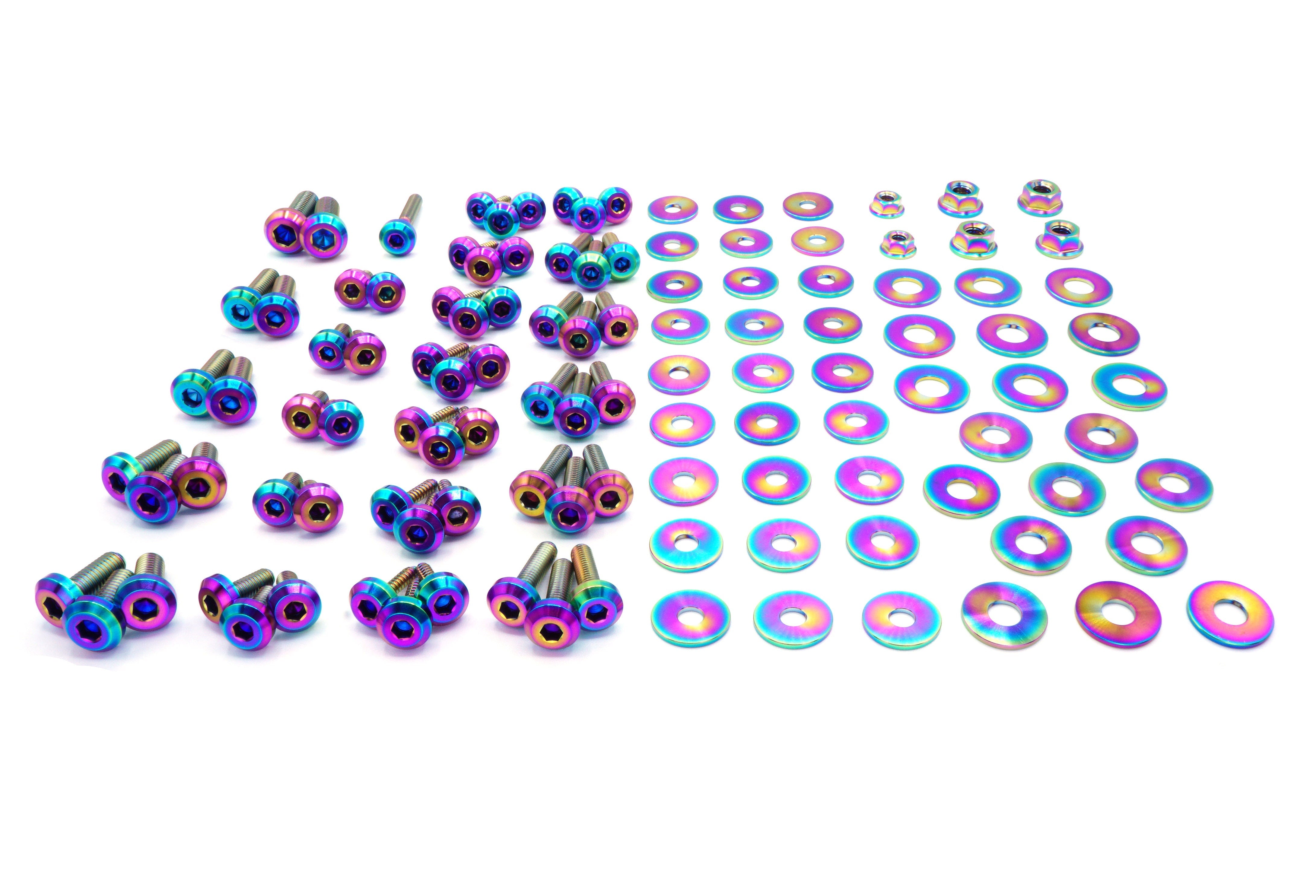 This 115 piece kit includes bolts, screws, nuts, and washers manufactured from extremely durable, anticorrosive, and lightweight GR5 titanium metal.