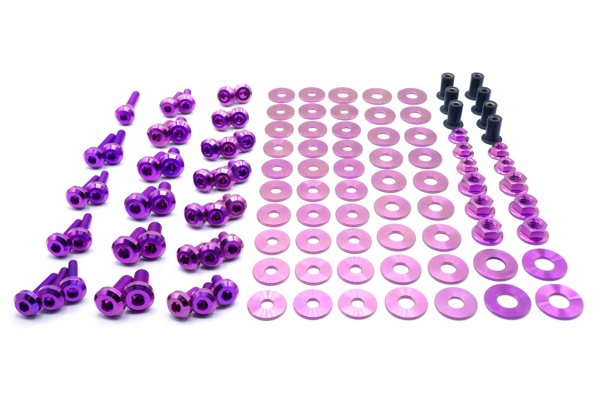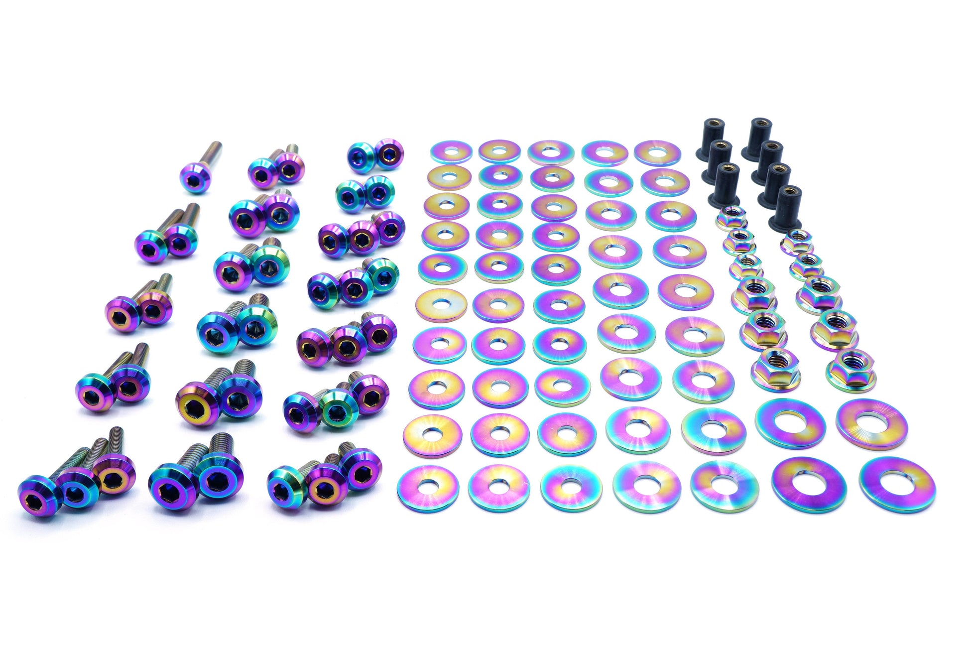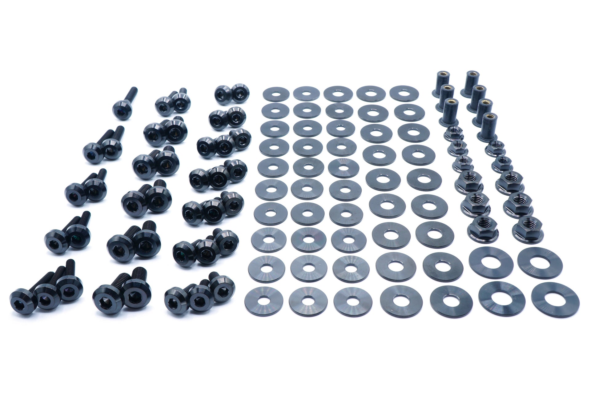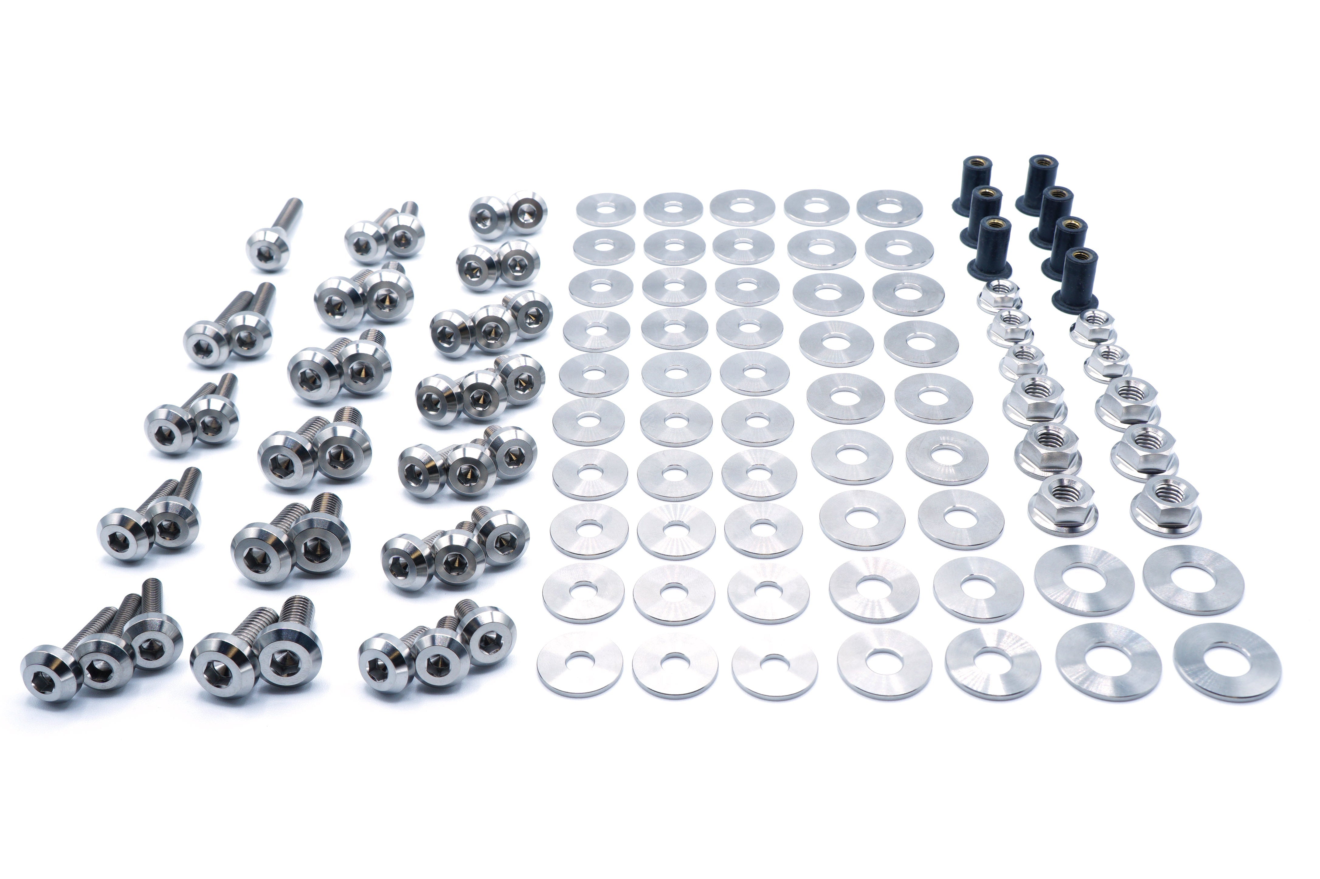 This 111 piece kit includes bolts, screws, nuts, and washers manufactured from extremely durable, anticorrosive, and lightweight GR5 titanium metal.