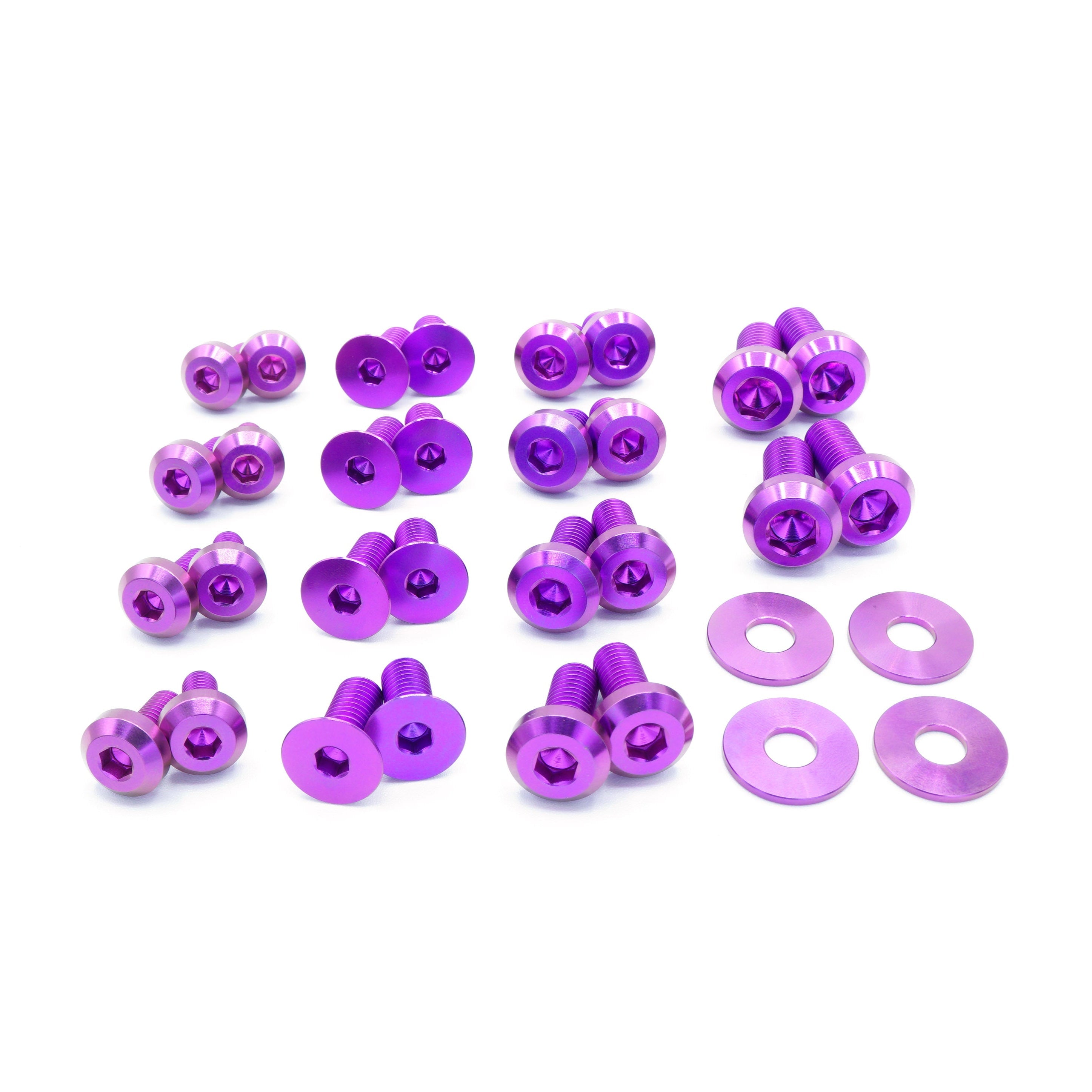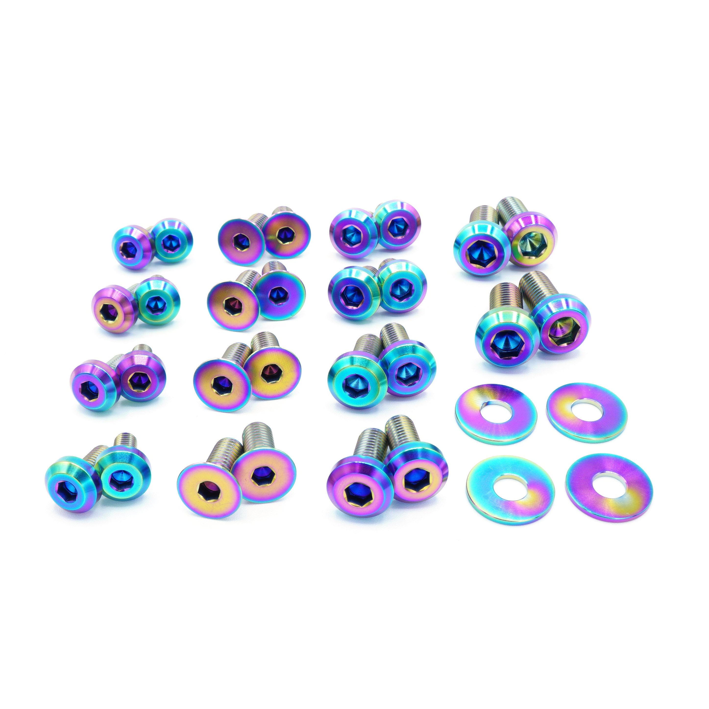 This 30 piece kit includes bolts and washers manufactured from extremely durable, anticorrosive, and lightweight GR5 titanium metal.